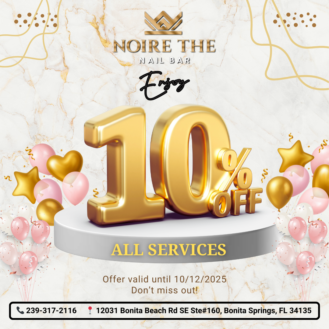 Welcome to Noire The Nail Bar, the premier destination for nail and beauty services in Bonita Springs, FL 34135. We specialize in delivering a luxury experience with a wide range of professional services, including manicures, pedicures, artificial nails, nail art, waxing, and spa treatments. From classic nail care to the latest trends like Gel X, dipping powder, and ombré nails, our skilled technicians ensure your nails look flawless every time.